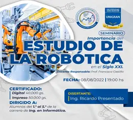 Este seminario busca proporcionar información para ampliar los conocimientos del alumno, acerca del estudio y la implementación de la robótica, los procesos de digitalización, las soluciones de automatización que hacen posible aumentar la productividad y la calidad de los productos, así como la reducción de los defectos y el tiempo empleado.